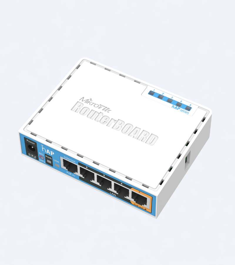 This small home access point is the perfect device for homes or small offices where all you need is a wireless AP and a few wired devices connected. Based on the popular RB951-2n, the hAP is an improvement in many areas.The device can be powered from the power jack or with passive PoE from a PoE injector. hAP provides PoE output function for port #5 — it can power other PoE capable devices with the same voltage as applied to the unit. Maximum load on the port is 500 mA. The hAP is preconfigured, so all you need to do, is plug in the internet cable, the power, and start using the internet by connecting to the MikroTik network.
